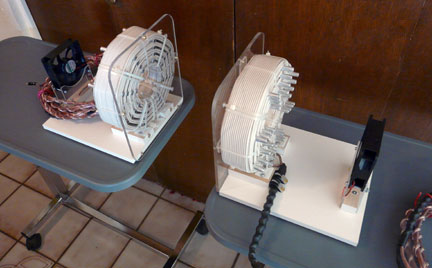 | The white cabinet shown in the bottom includes the control unit of the coil machine: the capacitor bank, the control switches, the current meter, and the connection terminals for the function generator (shown on top), power amplifier (middle) and the coil. The power amplifier and the function generator are included in the price of the machine. They are shipped separately and the user can connect them to the control unit with a couple of cables: like connecting a VCR and a DVD player to a TV. All cables, plugs, and instructions to connect are included with the desktop. No tools and technical skills are needed. This machine requires ONE coil for operation. The machine can work with our special air-cooled coil, or a traditional "basic" coil. Included in the price are Coils are sold separately below. Click here for a diagram of the control knobs