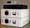 | This machine was developed to overcome the fact that the magnetic field generated by a single coil decays quite rapidly with the distance from the surface of the coil. There are two advantages in using two coils: 1. The volume in which the magnetic field strength is above 100 gauss is doubled. 2. The experimental time is cut in half. The 3D coil machine includes a control unit (bottom white box), and an extension unit (upper white box) that allows the machine to be used with two coils. The units can also be purchased separately below. The 3D machine can work with one or two coils. It has two sets of capacitors (one for each coil) and a special electronic circuit that controls the phase of the magnetic fields generated by the two coils. The 3D machine can be used in 3 different modes.