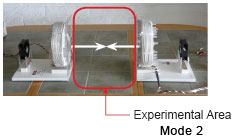 In Mode 2, the two coils are electronically coupled, and should be positioned facing each other (with their acrylic sides) 6-20 inches apart. The experimental area is between the two coils. This configuration is somewhat analogous to a Helmholtz coil. This configuration produces a more uniform (homogeneous) magnetic field than Mode 1. (The volume in which the magnetic field strength is above 100 gauss is doubled.) Click here for a diagram of the magnetic field generated by two coils in this configuration when the coils are 6 inches apart. Click here for a diagram of the magnetic field generated by two coils in this configuration when the coils are 16 inches apart. The coils should be placed as close together as the size of the experimental area permits.